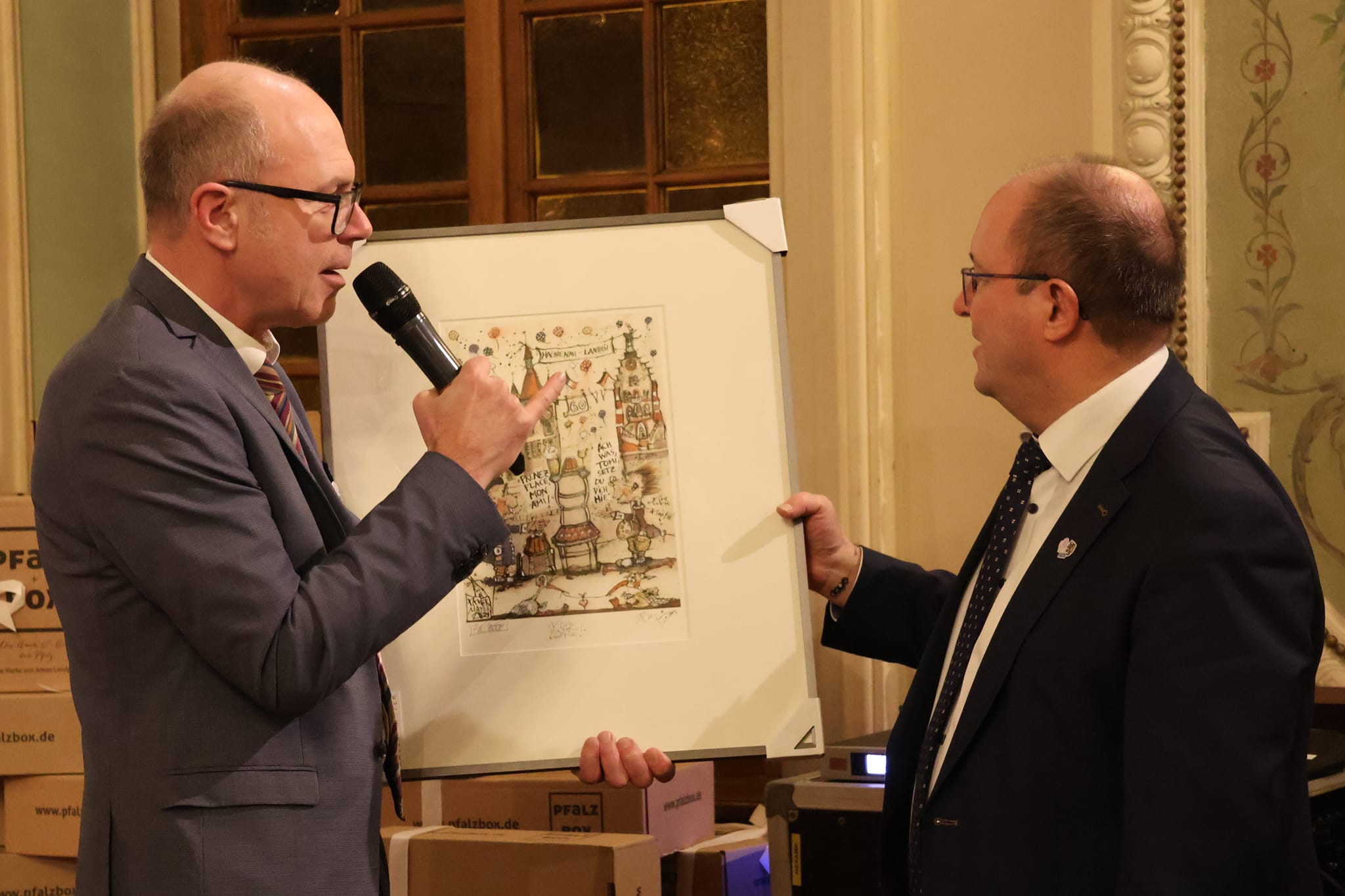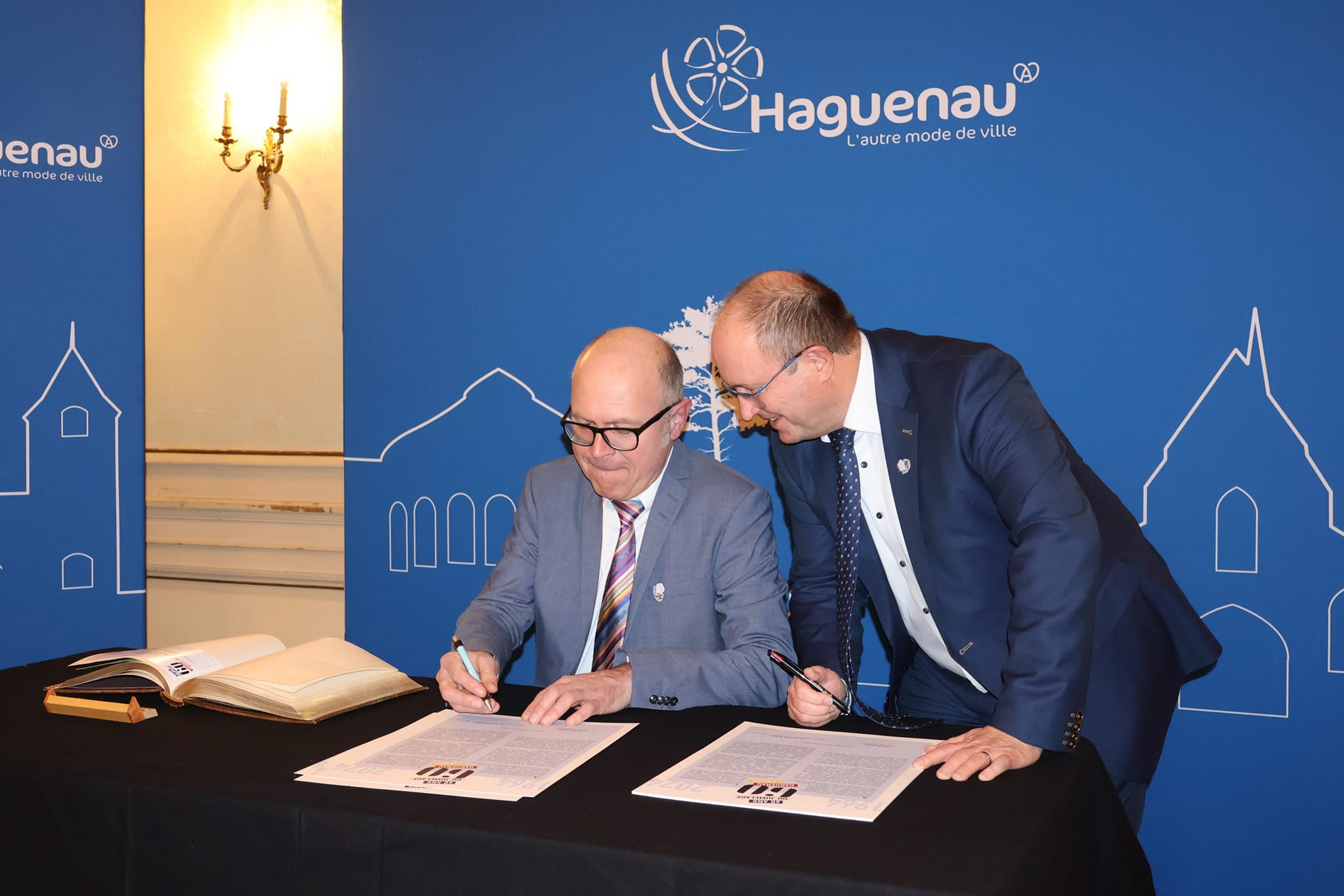 Il s’agissait du premier acte des célébrations du soixantième anniversaire du jumelage : une délégation haguenovienne emmenée par le maire Claude Sturni a été reçue dans le Palatinat par Dominik Geißler, Oberbürgermeister de Landau.